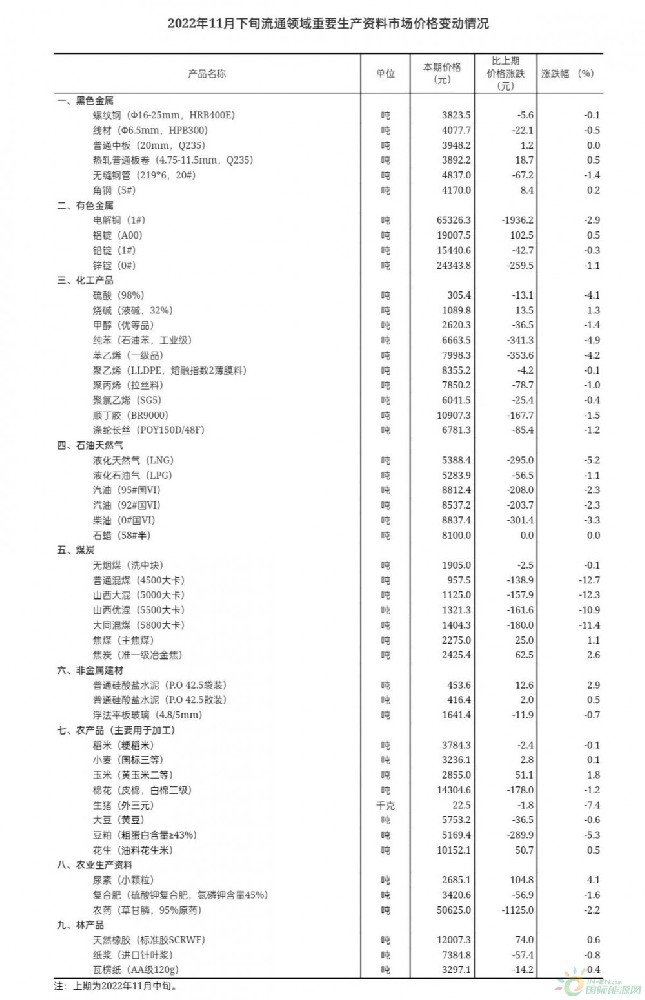 行業(yè)資訊當(dāng)前位置:首頁>新聞中心>行業(yè)資訊國家統(tǒng)計局:11月下旬柴油、液化天然氣價格下跌發(fā)布日期:2022-12-2212月4日,國家統(tǒng)計局發(fā)布11月下旬流通領(lǐng)域重要生產(chǎn)資料市場價格變動情況。數(shù)據(jù)顯示,柴油、液化天然氣等35種生產(chǎn)資料市場價格出現(xiàn)下跌。 據(jù)對全國流通領(lǐng)域9大類50種重要生產(chǎn)資料市場價格的監(jiān)測顯示,2022年11月下旬與11月中旬相比,13種產(chǎn)品價格上漲,35種下降,2種持平。其中,尿素、鋁錠、天然橡膠、焦炭出現(xiàn)漲幅,電解銅、農(nóng)藥、純苯、苯乙烯、柴油、液化天然氣價格下跌。 |